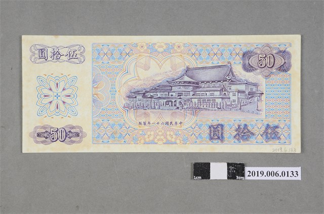 本文物為臺灣銀行發行伍拾圓紙鈔(民國61年版)。民國38年6月15日臺灣省政府實行幣制改革,公布「新臺幣發行辦法」,發行「新臺幣」(改制前為舊臺幣),舊臺幣肆萬圓兌換新臺幣壹圓,民國38~49年發行之新臺幣版面為直式,民國50年為橫式,民國50年5月1日開始印製新版橫式紙鈔。此為民國61年伍拾圓版本,由中央印製廠印製,紙鈔版面顏色為紫色,正面為孫中山國父像,背面圖案為陽明山中山樓。