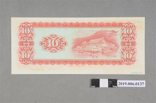 本文物為臺灣銀行發行拾圓紙鈔(民國58年版)。民國38年6月15日臺灣省政府實行幣制改革,公布「新臺幣發行辦法」,發行「新臺幣」(改制前為舊臺幣),舊臺幣肆萬圓兌換新臺幣壹圓,民國38~49年發行之新臺幣版面為直式,民國50年為橫式,民國50年5月1日開始印製新版橫式紙鈔。此為民國58年拾圓版本,由中央印製廠印製,紙鈔版面顏色為紅色,正面為孫中山國父像,背面圖案為陽明山中山樓。