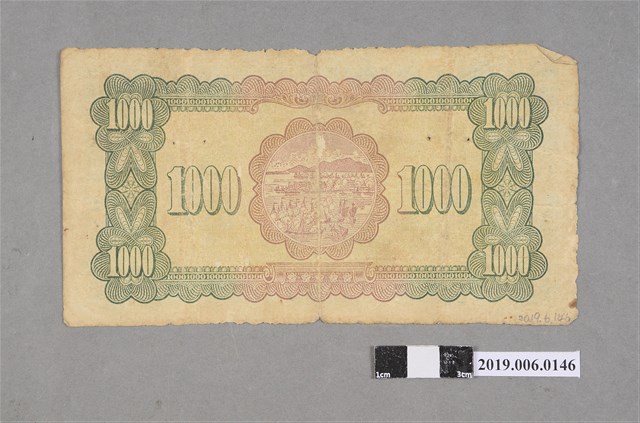 本文物為臺灣銀行發行壹仟圓紙鈔(民國37年版)。民國35年5月20日臺灣省行政長官公署接收日治時期「株式會社臺灣銀行」,改組成立「臺灣銀行」,於同年5月22日發行「臺幣」(後因改制為新臺幣,故又俗稱舊臺幣)。此為民國37年壹仟圓版本,印刷廠分別有「中央印製廠」及「第一印刷廠」兩個版本,本版為第一印刷廠印製,紙鈔版面顏色為藍色,正面為孫中山國父像、臺灣銀行總行,特別在左右兩側邊框分別印有稻米及甘蔗,凸顯當時臺灣兩大經濟作物,背面圖案印有海戰圖。