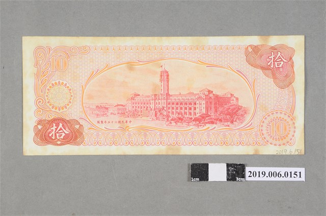 本文物為臺灣銀行發行拾圓紙鈔(民國65年版)。民國38年6月15日臺灣省政府實行幣制改革,公布「新臺幣發行辦法」,發行「新臺幣」(改制前為舊臺幣),舊臺幣肆萬圓兌換新臺幣壹圓,民國38~49年發行之新臺幣版面為直式,民國50年為橫式,民國50年5月1日開始印製新版橫式紙鈔。此為民國65年拾圓版本,由中央印製廠印製,紙鈔版面顏色為紅色,正面為孫中山國父像,背面圖案為中華民國總統府。