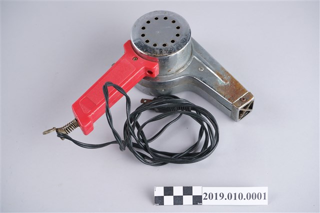 此文物為捐贈人居住於彰化員林父親所使用過的吹風機,目前仍可正常使用。為1960~1980年代左右所使用吹風機,多使用於髮廊及美容院,由皇冠牌CROWN生產,當時具冷熱風功能之吹風機,多以相似外型生產。外表略有生鏽,把手為塑膠製,機體為金屬製,接上插頭即使用,把手設有切換熱風及冷風功能,左側封口貼有製造商商標,塑膠手把及金屬機體接合處有裂縫。