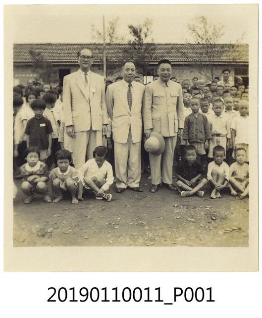 本文物為蔣經國巡視宜蘭小學照片,根據國史館紀錄,蔣經國在1957到1958年間曾兩次到宜蘭了解榮民生活,並至宜蘭各處考察。照片從右數來第1位為蔣經國,第二位為當時退除役官兵輔導委員會的主委趙聚鈺,第3位為當時的宜蘭縣長甘阿炎。蔣經國手持帽子,正與民眾進行談話。