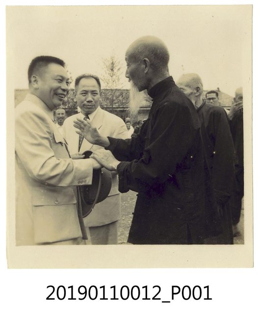 本文物為蔣經國巡視與老人對話照片,根據國史館紀錄,蔣經國在1957到1958年間曾兩次到宜蘭了解榮民生活,並至宜蘭各處考察。照片從右數來第1位為蔣經國,第二位為當時退除役官兵輔導委員會的主委趙聚鈺。其中,蔣經國正與一名留著長鬍子的老人談話。