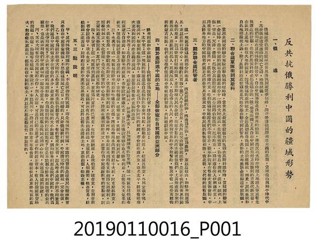 此件為〈反共抗俄勝利的中國疆域形勢〉文件。內容講述關於反共抗俄成功後對於中國疆域形勢的介紹,分為概述、聯合國軍隊衝到莫斯科、關於聯合國託管者、關於應歸還中國的土地、三點說明五項內容。