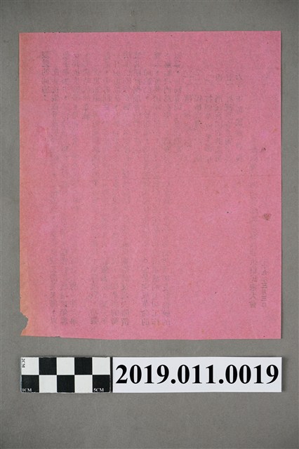 此件為由台灣省垣擁護蔣總統領導反共抗俄民眾大會於民國三十九年(1950)三月三日發表之文宣,內文主旨為呼籲民眾一起擁護蔣中正繼續領導反共抗俄之戰爭。