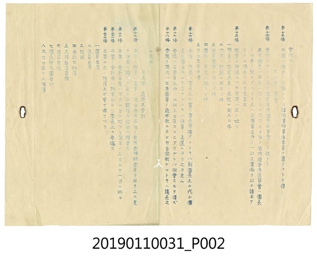 此件為平鎮庄青年團團則,共二十二條條文。內容包含青年團受平鎮街役場管理以及其組織管理、團員規範、幹部組織及選舉、集會事項與財務會計等。