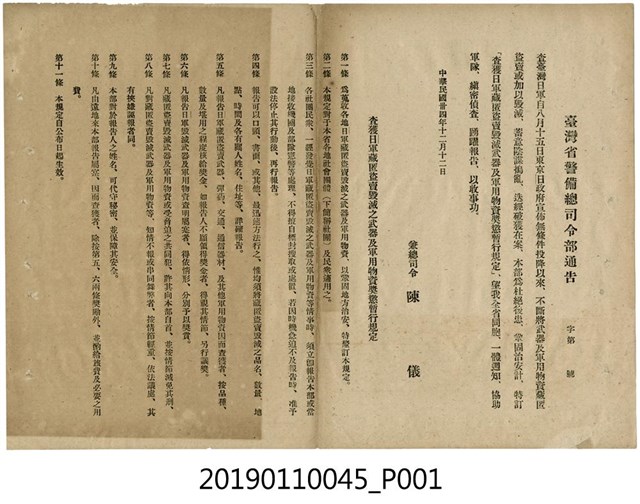 此件為台灣省警備總司令部通告,發文日期為民國三十四年(1945)十二月十二日,內容為「查獲日軍藏匿盜賣毀滅之武器及軍用物資獎懲暫行規定」之公告,陳儀為當時行政長官公署長官兼警備總司令部總司令。