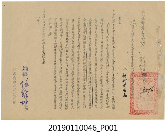 此件為台灣省專賣局訓令,中華民國三十五年(1946)七月二十五日公告。內容為戰後接收日人遺留之房地產、動產之相關規定,當時的專賣局長為任維均。