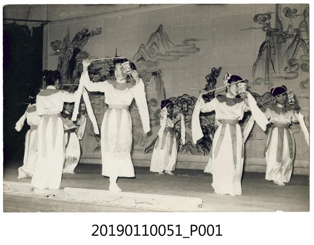 本文物為民族舞蹈劇照,照片中有八位女童,其皆扮相皆為雙包頭,身著仙女衣,每個人皆持小燈籠。舞台背景為國畫風格之高山、白雲。