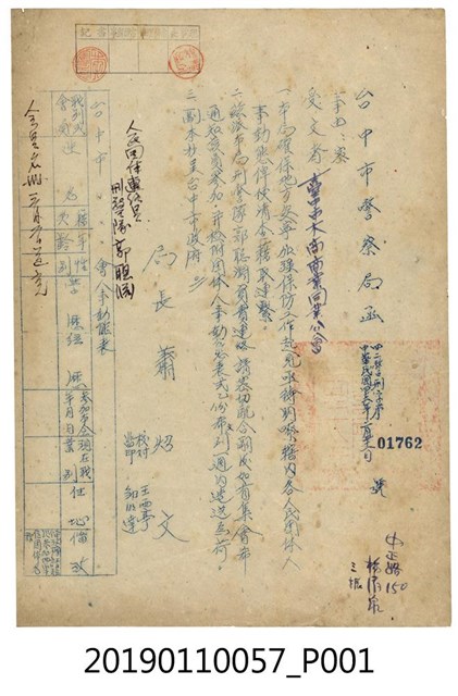 此文物為台中市警察局函,內容為了戒嚴時期警察局必須掌握轄區內各人民團體的人士動態,並派員監視各種集會而發給臺中市木商商業同業公會的公文。