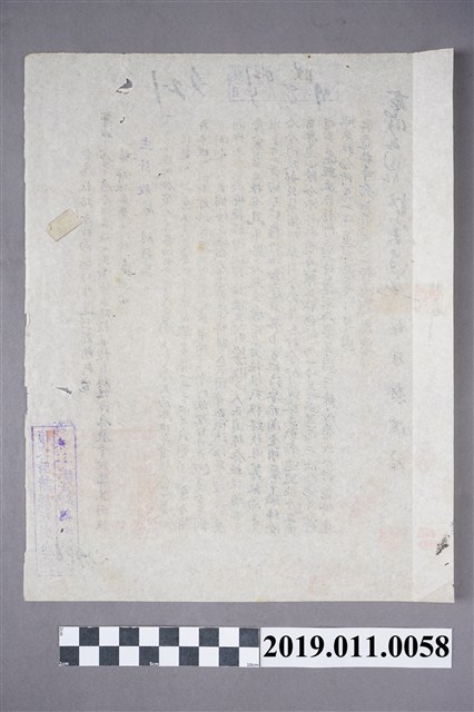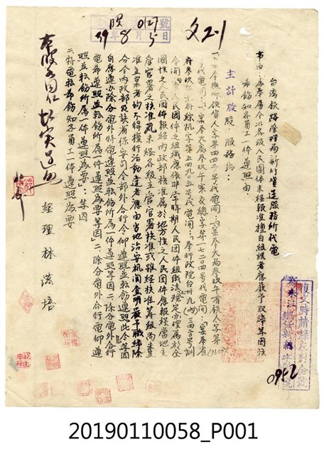 此文物為臺灣鐵路管理局新竹貨運服務所代電,為民國39年(1950)8月5日所發之公文,內容為奉令各級人民團體未經報合、擅自組織者,並嚴予取締,為通知員工的公文,公文上有許多印章,也有些微破損。
