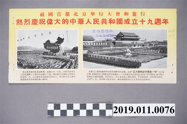 此文物為毛主席同全國工人代表和首都軍民歡度中華人民共和國19周年國慶的刊物,內容主要為「歡呼毛主席革命路線的偉大勝利,歡呼工人階級登上上層建築各個領域鬥批改政治舞台 毛主席同全國工人代表和首都軍民歡度國慶」,第一面左半邊為毛主席照片,背面有人們在天安門前歡慶國慶的照片。
