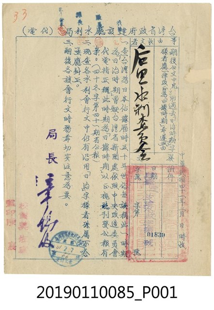 此文物為省政府水利代電,公文標題為「台灣省政府建設廳水利局(代電)」,時間為民國41年(1952)2月,收文者為后里水利委員會,公文紙有些地方已經有些損壞及摺痕。