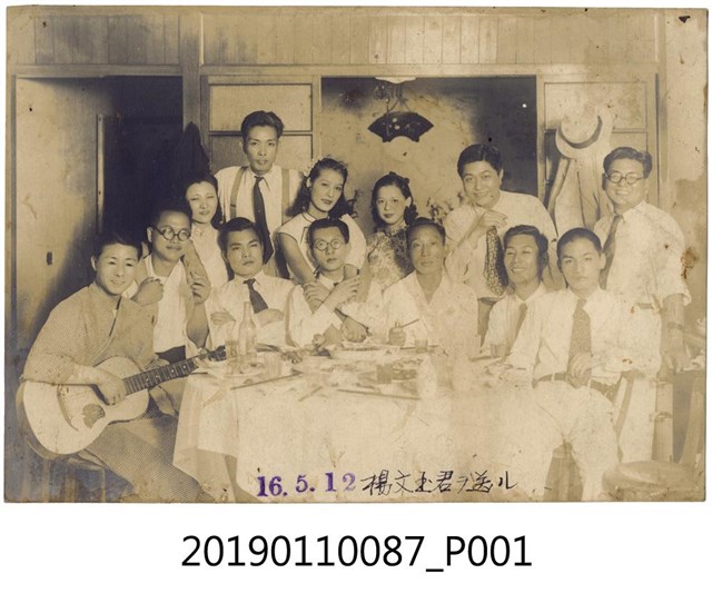 此文物為照片,照片為黑白,內容為日本藝伎與酒客圍在桌子旁的合照,照片中有的男士穿著西裝,女士則穿著旗袍,照片時間為日本時代昭和十六年(1941)。