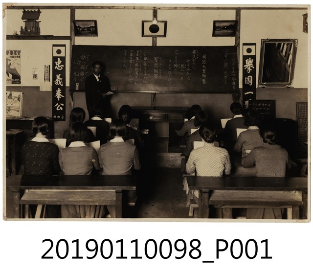 此文物為照片,內容為台中豐原翁子國語講習所學藝會紀念,為昭和14年(1939)所拍攝的黑白照片,照片內容為老師站在講台上給台下的學生上課。