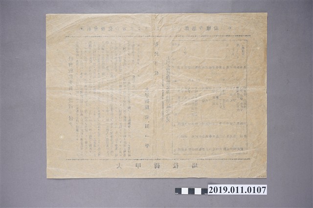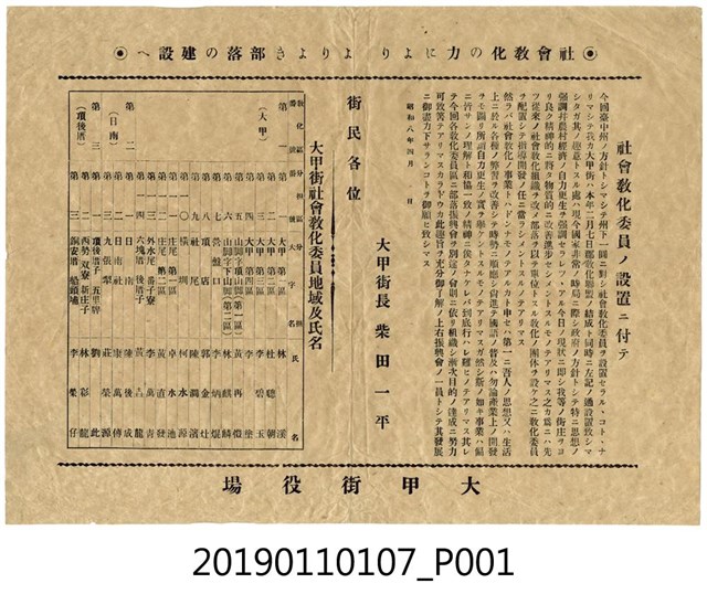 此文物為關於社會教化委員之設置之文件,於昭和8年(1933)大甲街長柴田一平所頒布,文件最上方標題為「社會教化の力により よりよき部落の建設へ 」,文件分左右兩邊,右半邊為「社會教化委員ノ設置ニ付テ」、左半邊為「街民各位 大甲街社會教化委員地域及氏名」,最下方為「大甲街役場」。