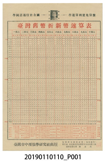 臺灣省中西數學研究社出版臺灣舊幣折新幣速算表