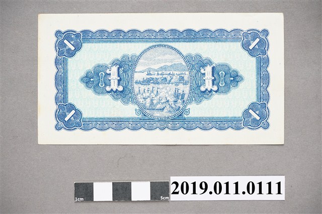 此文物為臺幣壹圓,民國35年(1946)版本的樣式,幣紙底色為白色,花紋顏色為深藍色,四個角都有印一個「壹」,最上方印有「臺灣銀行」的字樣及鈔票編號,中間圖案為國父孫中山,兩旁圖案分別為臺銀總行及臺灣圖案,圖案下方印有「中華民國三十五年印」的字樣,兩旁有印兩個印章。