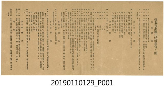 本文物為「臺北市北區生活改善會會則」,以日文印刷,內文共6章22條規定,規範其組織的事業目的、役員、職員、會議、會計等事項。