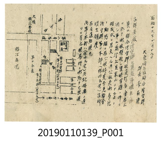 本文物為大龍洞聯合防空群群長李有連寫給各群長,其防空群第二本部設於林田氏宅,在文物左方,更畫有其相對位置圖。 家庭防空群的設置目的為,民眾可在空襲時,透過鄰里的互相幫忙,傳達警報訊息、防火滅火、救護等準備,每一防空群大約有20戶,群長及副群長由各戶長進行選舉。
