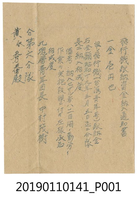 本文物為九塊厝青年團長中村茂樹於昭和19年(1944)所寫的飛行機獻納資金納入通知書,表示黃氏秀番所捐的金額為一金,為飛行機臺灣青年號的捐獻。