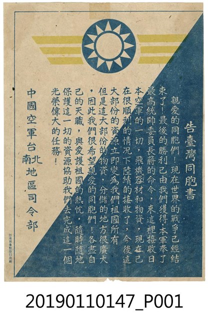 本文物為中國空軍台北台南地區司令部所公開的告臺灣同胞書,內容表示戰爭結束,空軍來台接收日軍飛機及物資,臺灣同胞應盡天職協助空軍完成接收。本文物斜線以上為白色區塊,下方為藍色區塊,最上方有一國徽。