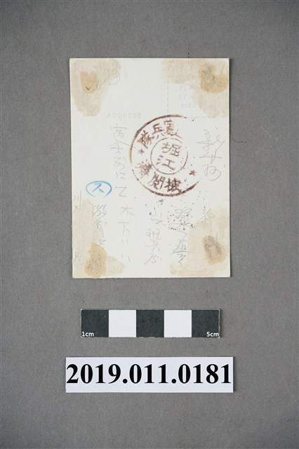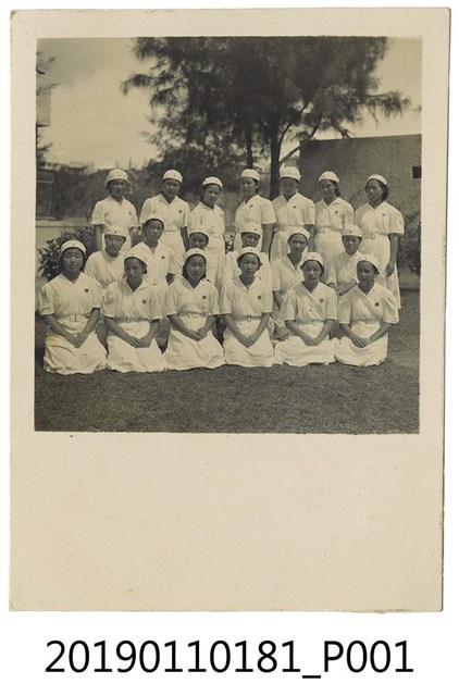 本文物的年代為日治時期,為一黑白名信片,其保存狀況良好。文物正面為19名穿著白色護士服的女性,其胸前皆有別紅十字徽章,其中第一排的人雙手交疊於腿上,人群後方可見屋舍及樹木。明信片背面蓋有「堀江 憲兵隊 檢閱」的印章,並以鉛筆寫有「宿舍るにて」、「教育」等字,明信片的四個角落皆有黏貼痕跡。