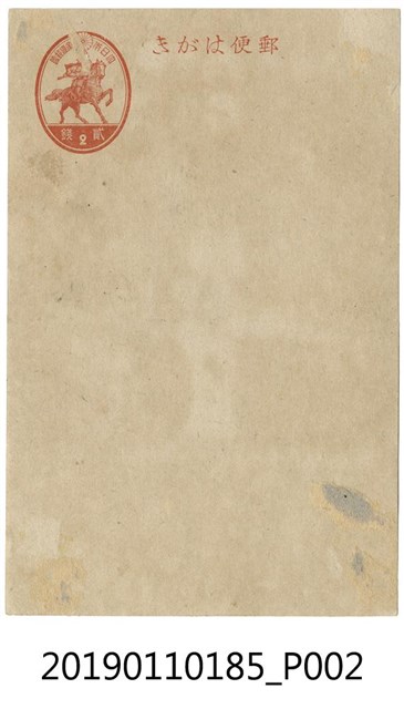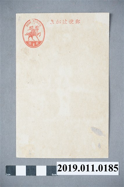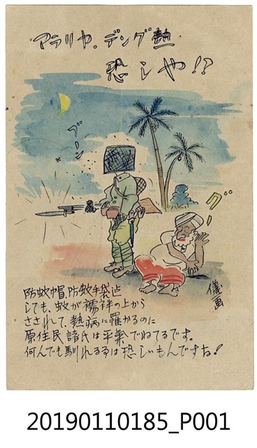 本文物的年代為日治時期,為一彩繪名信片。明信片正面畫有一名全副武裝且手拿刺刀的男子及一名包著頭巾的老人,該男子身邊有許多蚊子。圖的周圍寫有「マラリア、デンゲ熱 恐しや!?」、「……蚊が襦袢の上からさされて、熱病に罹かるのに」等字。 明信片背面印有「郵便はがき」及「大日本帝國郵便 貳錢」。明信片上方文字意思為「瘧疾、天狗熱,你害怕嗎?」
