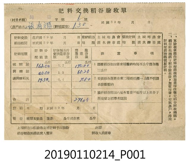 本文物為戰後初期肥料交換稻穀驗收單,並保存良好。文物上方資料有「民國39年 月 日」、「農戶姓名 張有讚」、「耕種面積1.30」等,且中央處可見紅色印泥。中央為表格形式,印有「肥料每公斤換蓬萊穀數量」、「土城鄉農會清水辦事處」、「稻谷經收機構……向肥料配銷機構領取肥料」等字及注意事項。最下方印有「稻谷經收機構負責人……」等字。