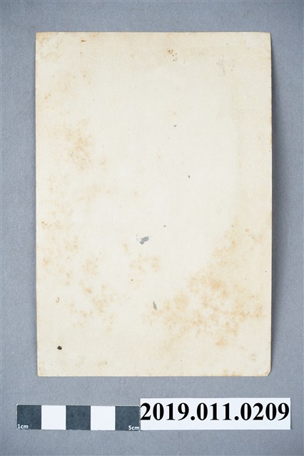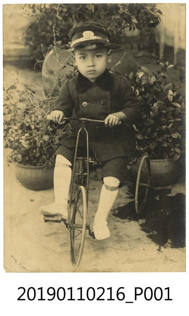 本文物為一張黑白照片。照片中有一名男童騎著三輪車,其後方有數盆植物。男童穿著深色長袖衣服,頭戴帽子,其帽子中央有徽章,男童的雙腳於膝蓋部位有束帶綁著。