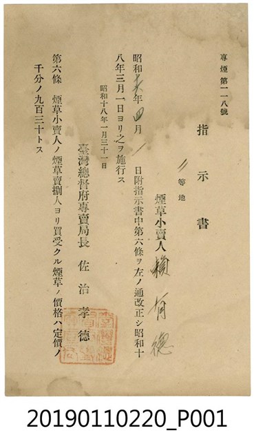 本文物年代為日治時期,為一官方文件,其保存狀況良好。文物右半部印有「專煙第一一八號」、「指示書」、「煙草小賣人賴有德」、「昭和十六年四月 附指示書中第六條ヲ左通改正シ……」等字。 左側印有「佐治孝德」及附帶之法條,內容為「第六條 煙草小賣人ノ煙草賣捌人ヨリ買受クル煙草價格ハ定價ノ千分九百三十トス」,並蓋有臺灣總督府專賣局長的用印。