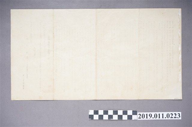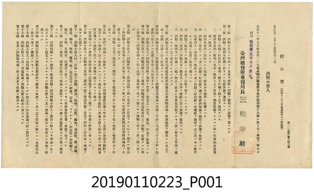 本文物年代為日治時期,為臺灣總督府專賣局公布之政令。文物上印有「指示書 昭和十二年五月專酒第四八一號決議」、「酒類小賣人」、「臺灣酒類專賣令施行規則第十九條」、「臺灣總督府專賣局長 三輪幸助」等字,一旁蓋有局長用印。本指示書共計17條內容,為規範酒類販售人應注意事項,其中第二條為酒類陳列儲藏應注意的事項,如清酒及麥酒應存放在溫度變化小的地方、店鋪最好的位置應用玻璃架子陳設等。