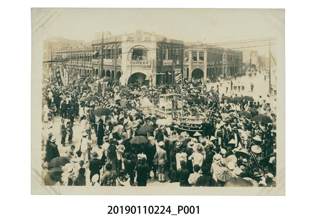 本文物年代為日治時期,為一黑白相片,其保存狀況良好,相片的四個角落有黑色印痕。相片中可見人群夾道歡迎廟會活動,其中一艘船寫有「恭迎 霞海城隍爺 聖駕」等字,船上坐著一人。 人群後方的建物二樓也擠滿人潮觀看,該建物有數塊招牌,如「增全齒科醫院」、「直榮堂製靴店」等,街道上亦可見電線桿豎立。