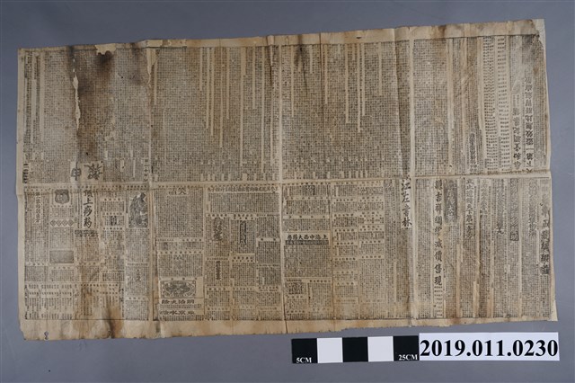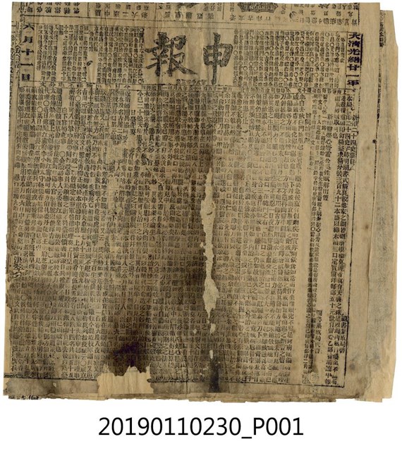 本文物為光緒21年(1895)所發行之申報,文物有多處破損及焦黑的痕跡。文物最上方印有商家廣告資訊,如老太古洋行、廣東邇遐齋等,文物中央印有「申報 第八千零三號」。下方橫列印有「上海零售每張取錢十文……西曆一千八百九十五年八月初一日……」。該報紙內容多元,有新版印刷的二十四史之售價、醫院治病記、日臺紀要等內容。