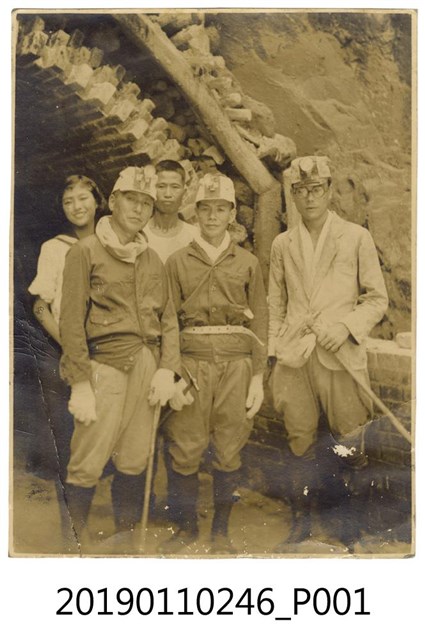 本文物為日治時期的黑白相片,其保存狀況良好。相片中可見四名男性及一名女性站在坑道口前合照。前排男性戴著安全帽及頭燈,其中一名手上拿著鐵器。該坑道口的內側由磚塊堆疊成拱門形,外圍則為木頭搭建。
