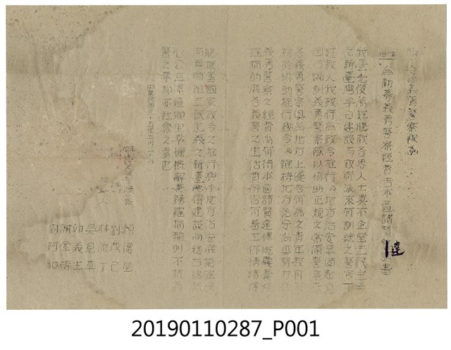 此為民國35年(1946)2月20日旗山區義勇警察隊函,目的為勸募義勇警察經費。略為破損,內容為宣導各界支持義勇警察並解釋經費用途。
