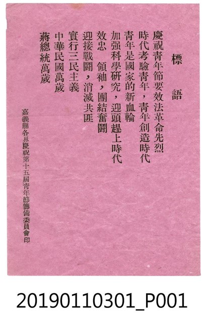此為嘉義縣慶祝第15屆青年節籌備委員會印行之反共標語,為紅底黑字,內容鼓勵青年效法革命先烈,效忠領袖與三民主義。