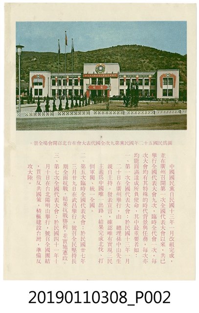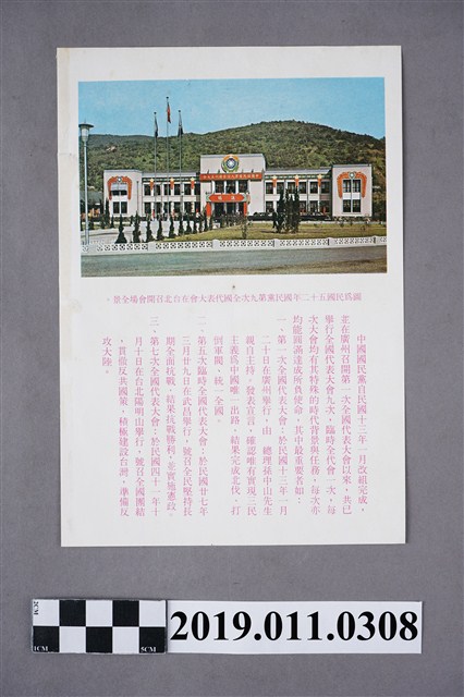 此為民國57年(1968)11月1日國民黨預計召開第十屆全國代表大會之傳單,訂於民國58年3月29日(西元1969年)召開,將以修改黨章、制定政綱、光復大陸等要點進行討論,背面簡述了幾次較為重要的全代會內容。