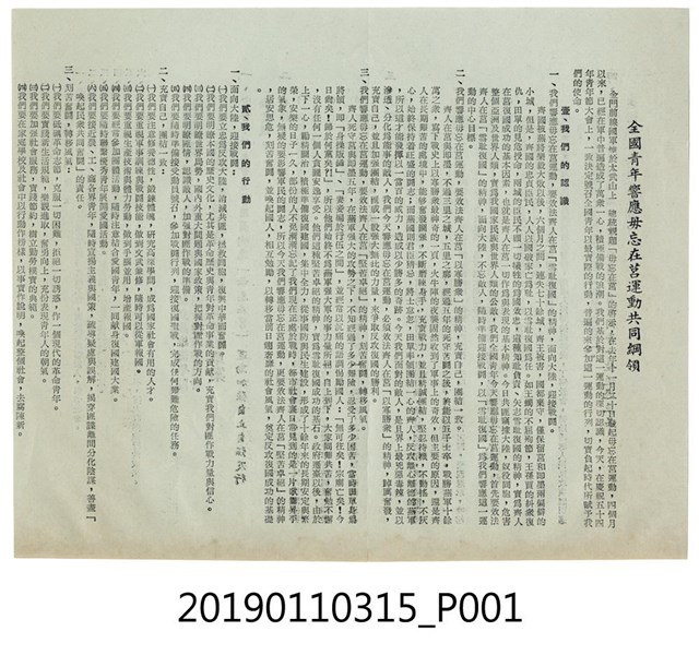 此為全國青年響應毋忘在莒運動共同綱領,綱領中引用了諸多典故,諸如齊人死守莒與即墨,並提醒青年勿忘隨時準備團結一致迎接戰鬥。