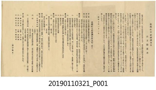 此為昭和7年(1932)2月1日台灣社會經濟調查所設立趣意書,內文草擬了九條規程,此調查所設立之主因乃為解決台灣社會經濟問題。