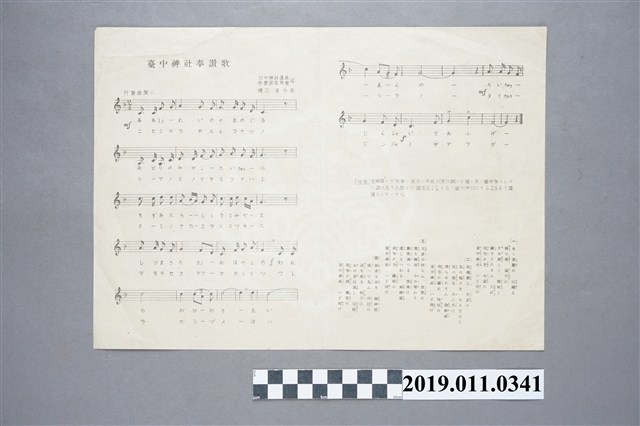 此為日治時期台中神社奉讚歌,由磯江清作曲,臺中神社遷座祭慶祝委員會作詞,正面有一圖騰,背面附有其樂譜。