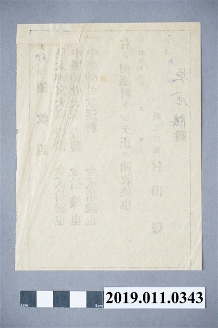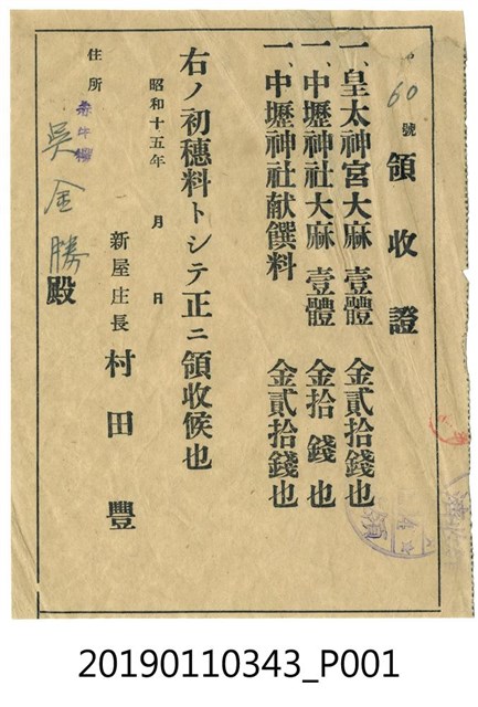 此為昭和15年(1940)吳金勝購買大麻(神符)之領收證,由新屋庄長村田豐發出,吳金勝購買了皇太神宮大麻、中壢神社大麻、中壢神社獻饌料,共付出50錢。