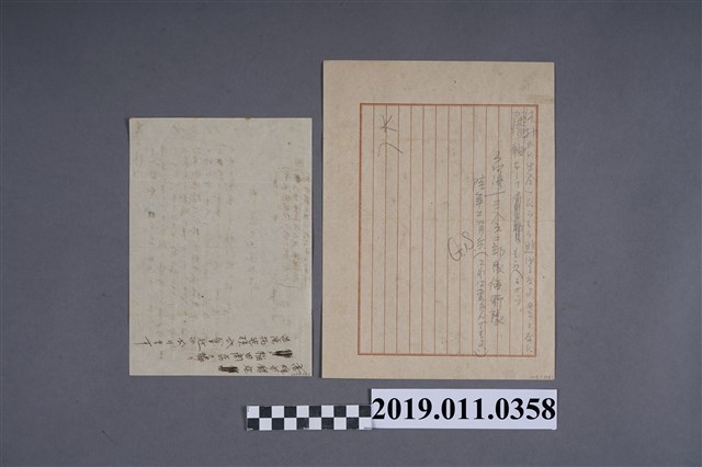 此為兩封昭和18年(1943)台籍日本兵出發前之家書,字跡潦草難以辨識內容,內容略有不同,應屬於不同單位,寄回地點也不同。其中一封信為陸軍二等兵之家書,另一封信是林灶荻的家書。