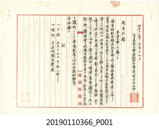 此為昭和18年(1943)月17日皇民奉公會所發出之公告,用以宣傳海軍特別志願兵制實施之演講會,時間是5月19日午後8時,地點位於中溪湖國民學校。
