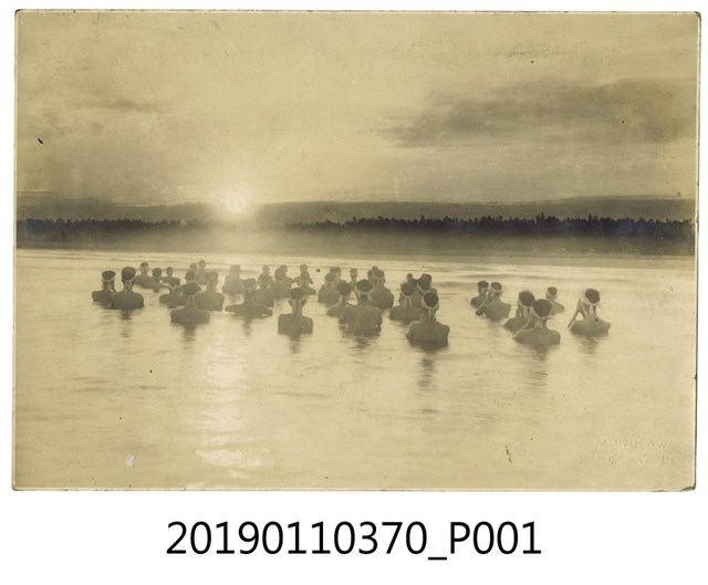 此為皇民練成所於溪水中訓練,無法得知其確切時間與地點,照片中可見多名學員頭綁白布條浸於水中,因不知時間,無法確定照片中景象為日出或日落。