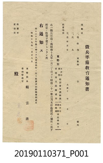 此為昭和19(1944)年1月18日徵兵準備教育通知書,表格已設定為東勢街住戶,入所式於20日午後2時舉行,由東勢街長賴雲清發出。
