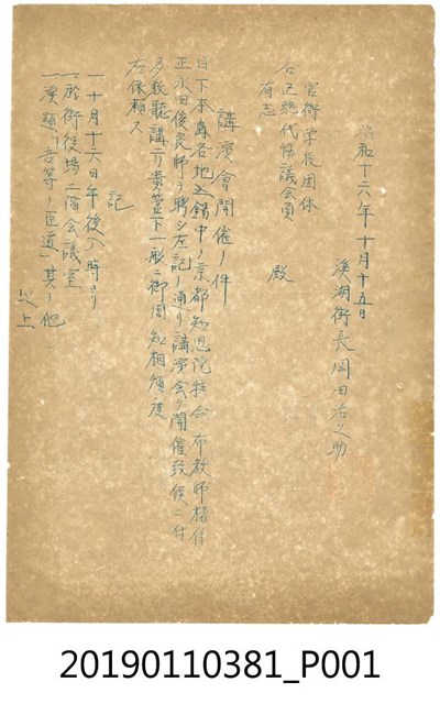 本文物為日本神道的佈教師演講通知公文,時間為昭和十六年(1941)10月15日,由西湖街長岡田治之助發文給官衙學校團體及石邊總代協議會員有志,其內容為在佈教師演講通知,時間為十月十六日午後在街役場二樓會議室,演講題目是「吾等的臣道」。