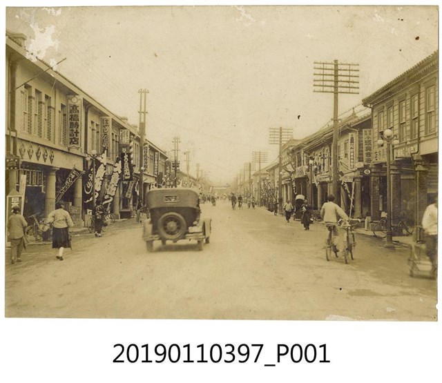 本文物為電線桿林立的街道照片,照片中道路沿途皆佈滿電線桿,在道路中央行駛著一臺汽車,道路兩旁則是有許多不同的商家,包含「高橋計時店」、「櫻井高等洋服店」、「源興商店」、「阿部萬丰華醫院」等。