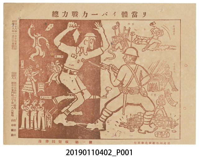 本文物為昭和18年(1943)皇民奉公會宣傳漫畫,由皇民奉公會新竹州支部發行,為戰力彙總對照繪圖,在漫畫右邊是日本積極備戰圖,左邊則是敵人享樂奢侈浪費圖。發行人為佐野治夫,印刷人為山中義雄。