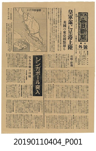 本文物為昭和17年1942年大《大阪每日新聞》報紙,內容包含「皇軍從星港登陸 英國的東亞據點崩」一文提及攻略的經過,以及「完全佔領在眼前」一文提及日本封鎖要塞化、世界制霸的軍略據點、反日華僑據點的本部崩壞等。